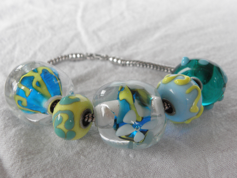 Handbeschilderde ringen Oktober 2011 |  Zilveren armbandje met grote glazen kralen December 2010 |  Paarse kraal met witte bloemen December 2010 |